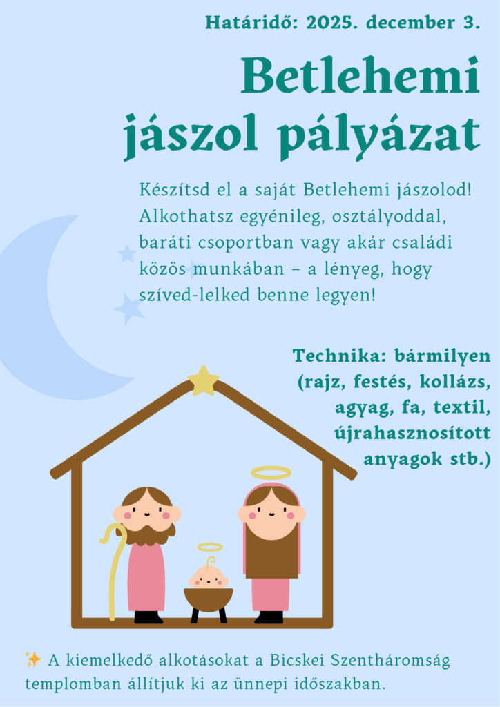 Betlehemi jászol pályázat Barnaföldi Anna 2025-11-16 Verseny, pályázat Bejegyzés navigáció Previous Previous post: Márton-nap az iskolábanNext Next post: „Áldom az Urat minden időben.” Zs. 33, 2