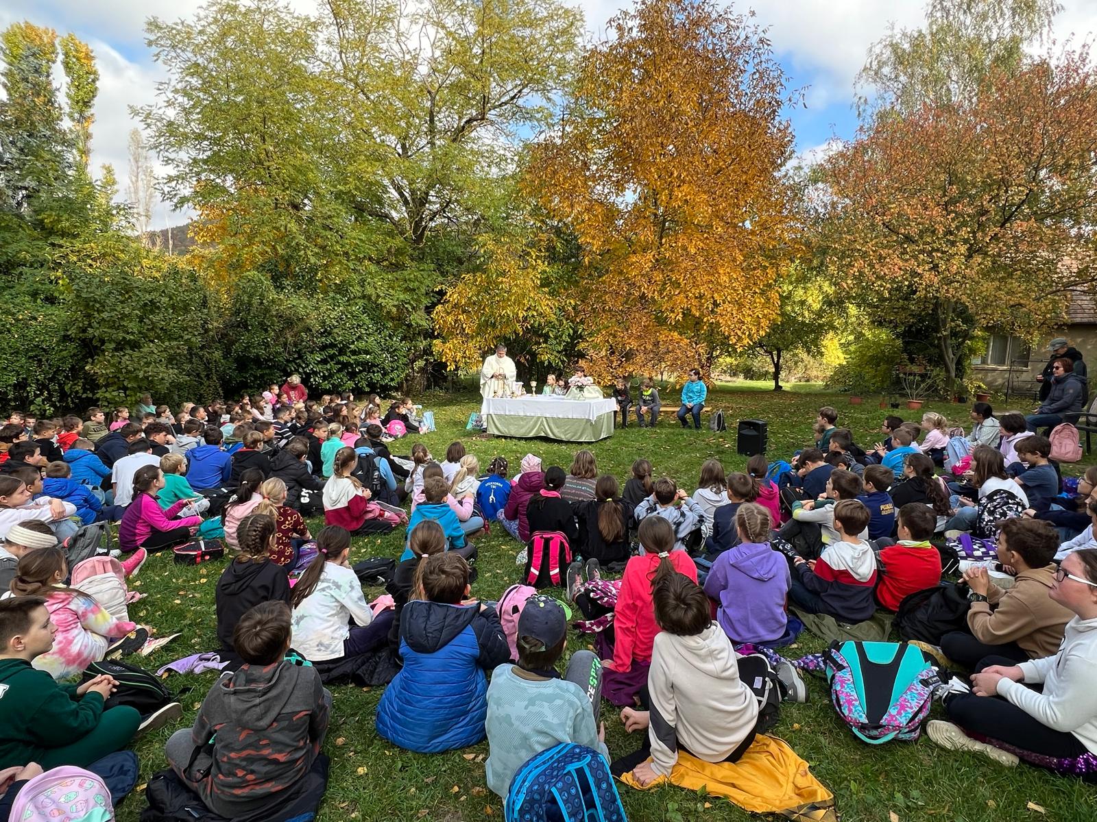 Október 15-én iskolánk apraja-nagyja útra kelt, hogy közösen zarándokoljunk Csabdira. Már reggel érezni lehetett a különleges hangulatot: a testvérosztályok kézen fogva indultak útnak – kicsik és nagyok együtt. Az őszi napsütésben vidám beszélgetések, nevetések kísérték a menetet.